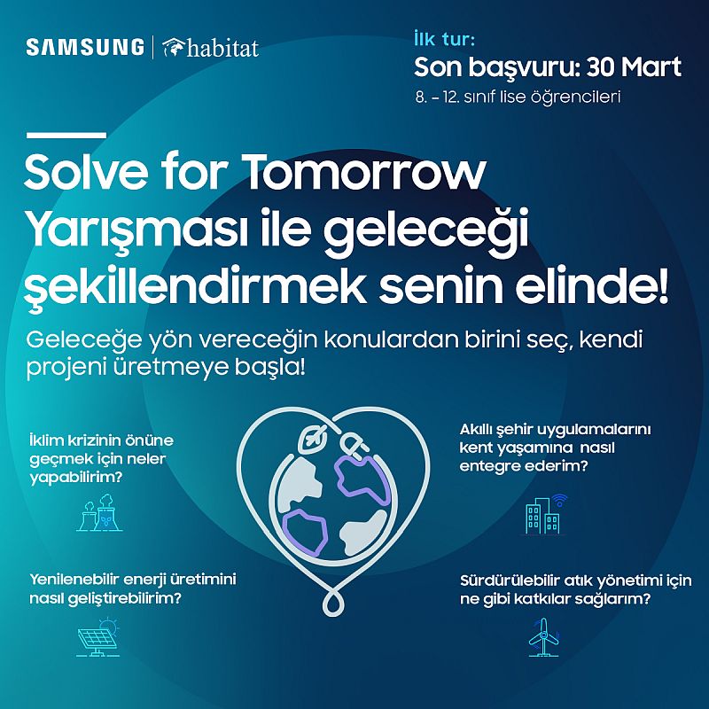 Solve for Tomorrow bilim yarışmasıSamsung Electronics Türkiye ve Habitat Derneği iş birliği ile düzenlenen ve kültür bilincine sahip, bilime ve sanata önem veren, yenilikçi bir kuşağın yetiştirilmesini hedefleyen “Solve for Tomorrow” (Yarın için Çözüm) bilim yarışması için başvuru dönemi uzatıldı. Bu yıl düzenlenecek yarışmaya başvurular, 30 Mart 2022 tarihine kadar https://www.samsung.com/tr/solve-for-tomorrow/ adresi üzerinden yapılabilecek.